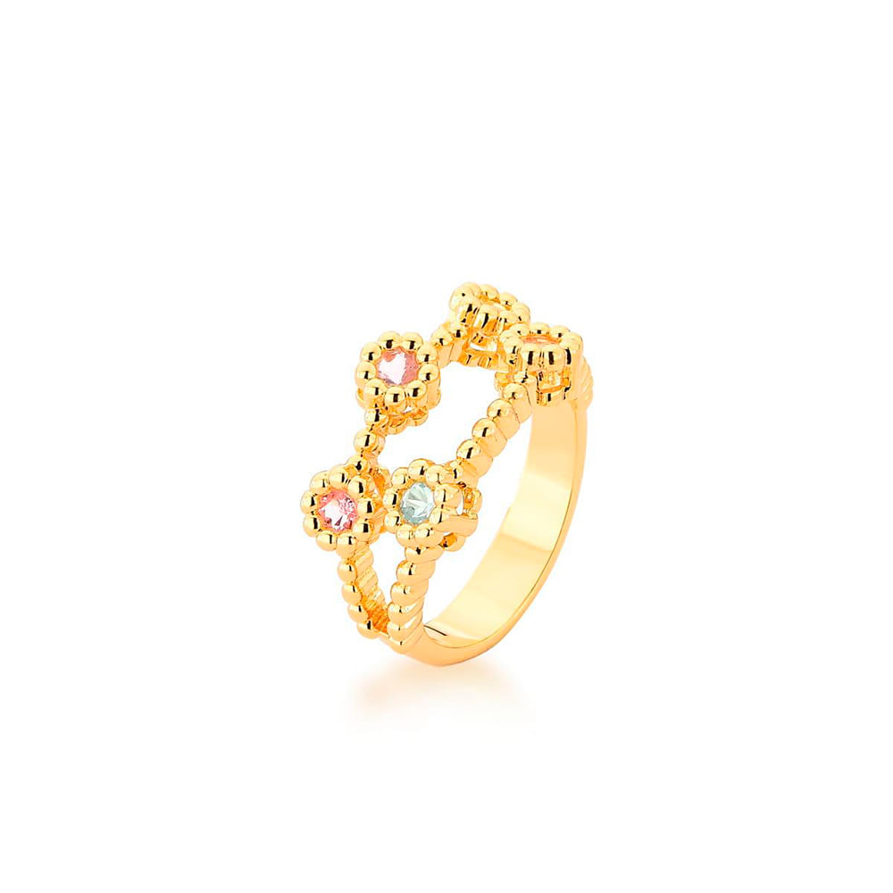 Anel banhado em ouro 18K com detalhes granulados e pedras redondas em cristais coloridos.