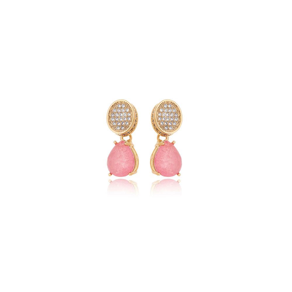 Brinco Amoré Gota Base Redondo Cravejado banho Ouro 18k Cristal Fusion Rosa U |