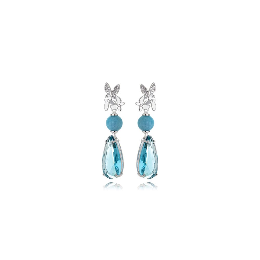 Brinco Aqua Base Borboleta Gota Cravejado Banho Ródio Cristal Azul U |