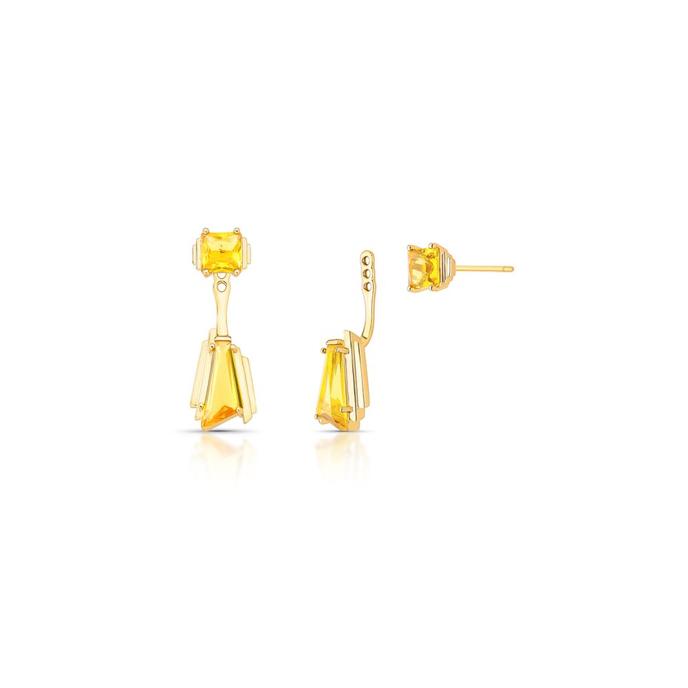 Brinco ear jacket dois em um com design geométrico e cristais que garantem brilho moderno e sofisticado. Banhado a Ouro 18K, pode ser usado de duas formas, trazendo versatilidade e estilo em uma única peça perfeito para compor looks elegantes e contemporâneos.