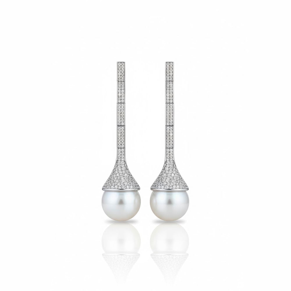 Brinco Longo Cravejado Ponta Banho Ródio Pérola Shell Transparente U |