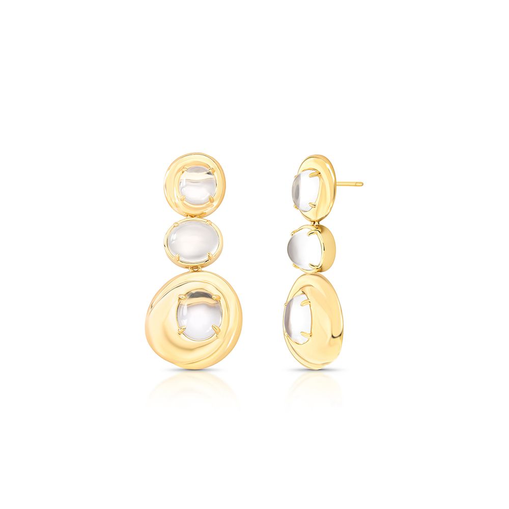 Brinco longo liso com design em meio oval e detalhe em cristal, trazendo linhas modernas e um visual elegante. Banhado a Ouro 18K, é uma peça leve, sofisticada e perfeita para iluminar a produção com um toque de brilho minimalista.