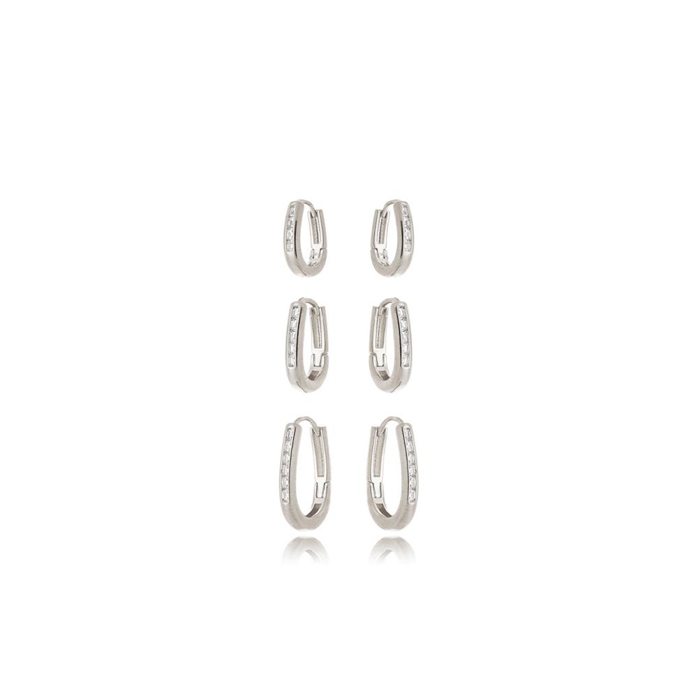 Brinco Trio Argola Click Banho Ródio Cristal Transparente U |
