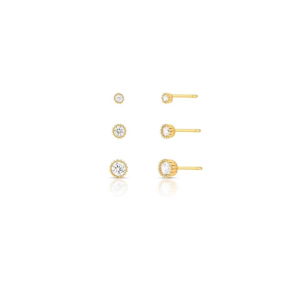 Brinco composto por trio de pontos de luz com acabamento cravejado em zircônias, proporcionando brilho delicado e sofisticado. Banhado a Ouro 18K, é uma semijoia versátil e atemporal, perfeita para uso diário ou para composições elegantes em múltiplos furos.