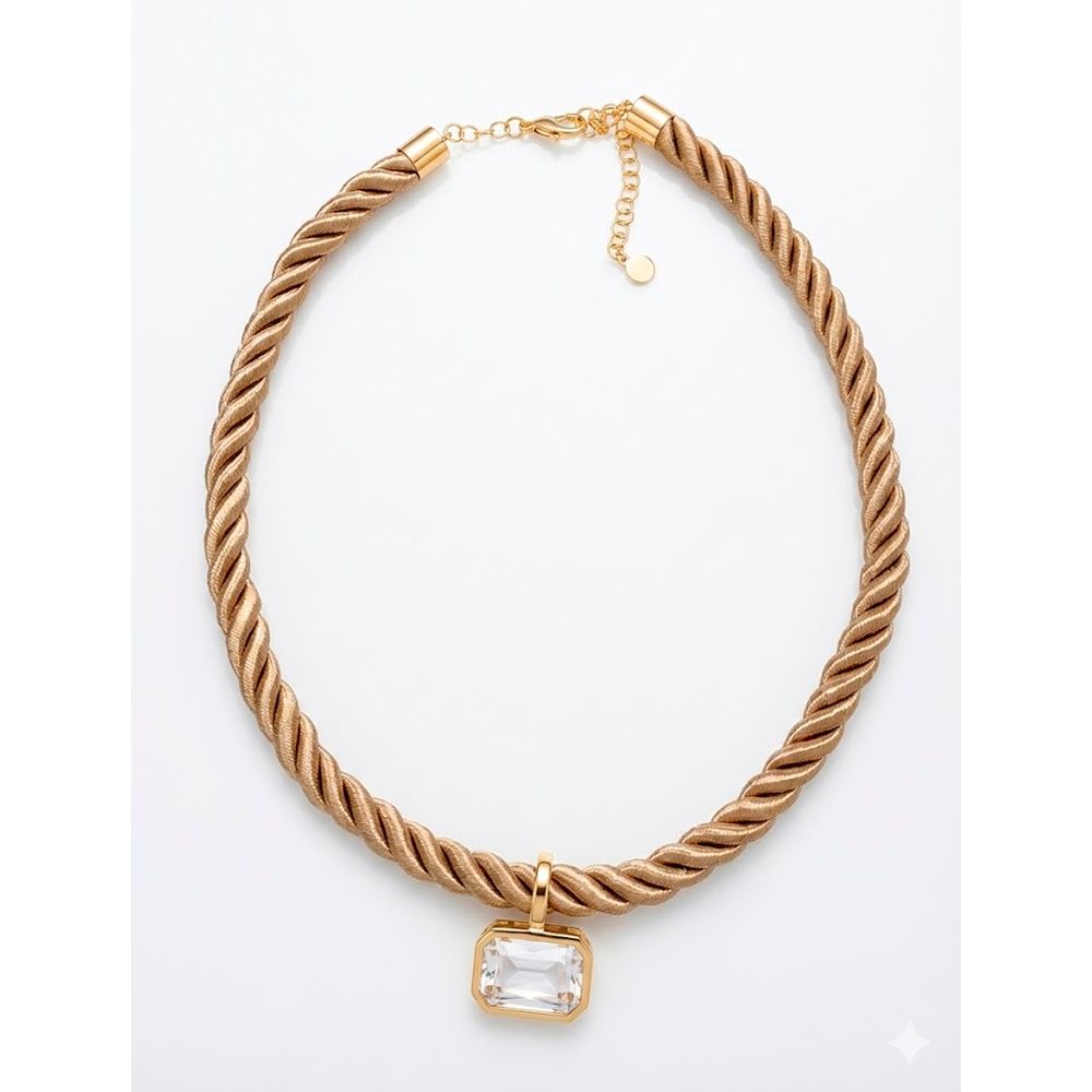 Colar com cordão torcido e pingente retangular em cristal, que adiciona brilho elegante e um toque moderno ao visual. Banhado a Ouro 18K, é uma semijoia sofisticada e versátil, ideal para iluminar produções do dia a dia com estilo e personalidade.
