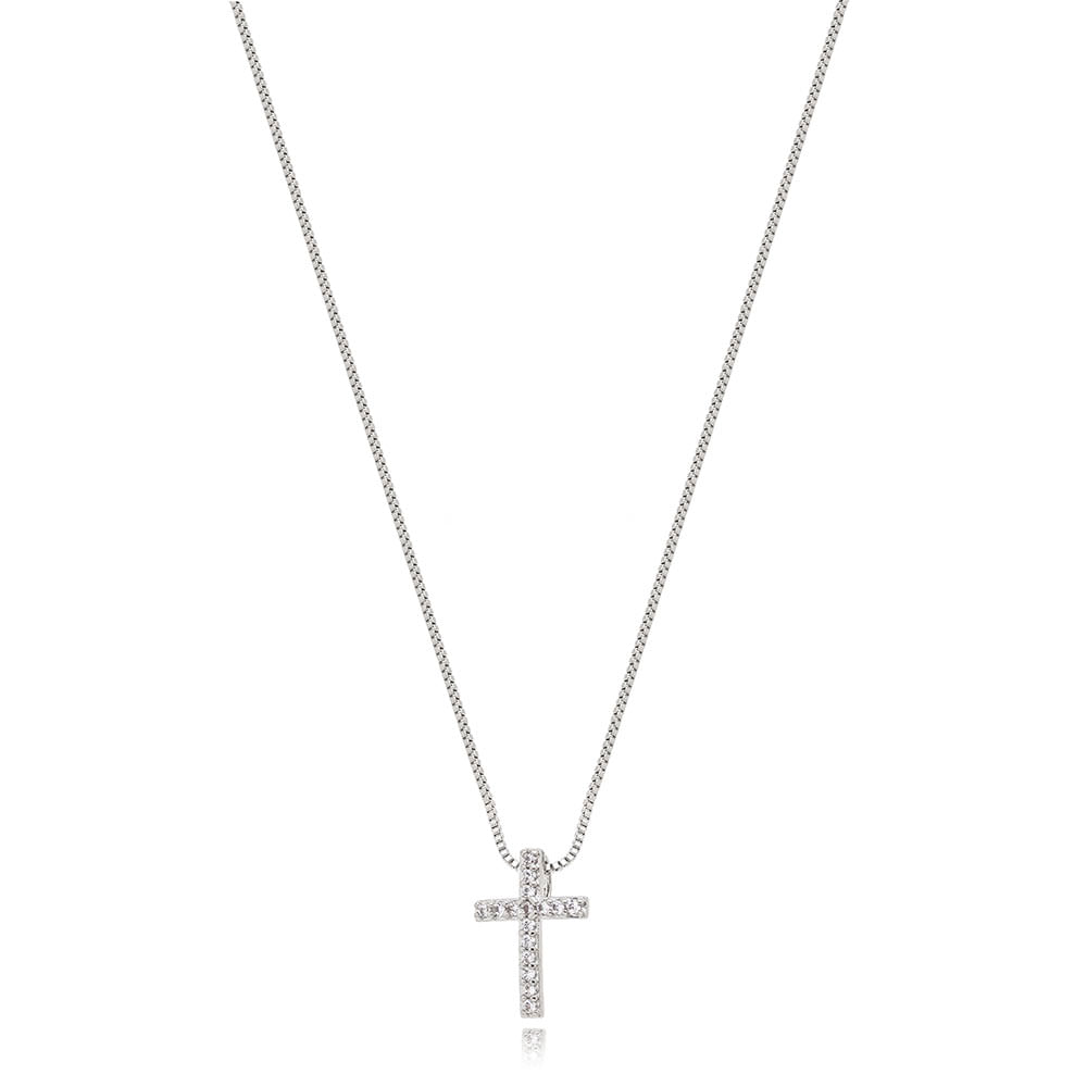 Colar de cruz com detalhe cravejado em zircônia transparente.