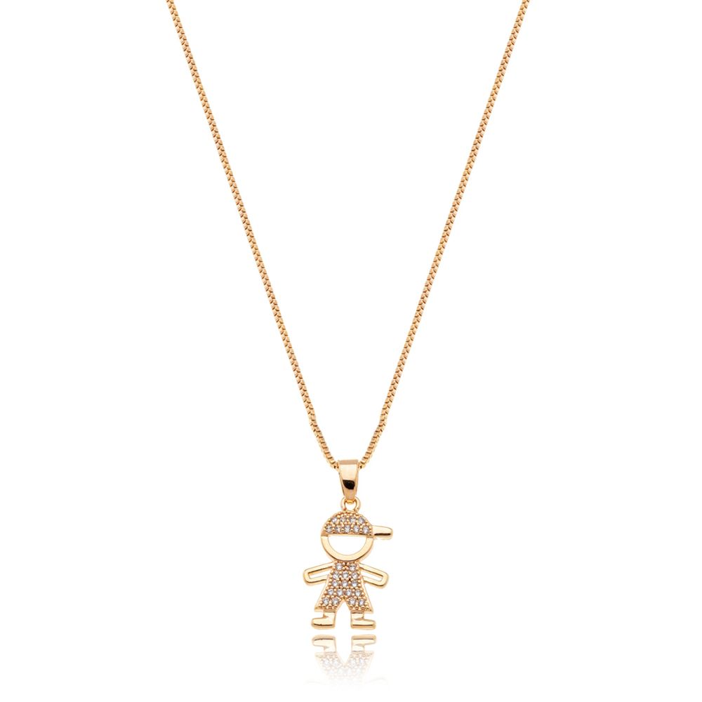 O Colar Delicado Menino Cravejado é uma semijoia cheia de significado e delicadeza. O pingente em formato de menino é cuidadosamente cravejado com zircônias, criando um brilho sutil que valoriza o design e torna a peça ainda mais especial.