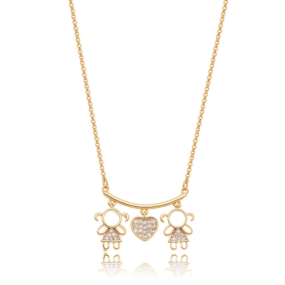Colar Pingentes Meninas e Coração Cravejado Banho Ouro 18K Transparente U |