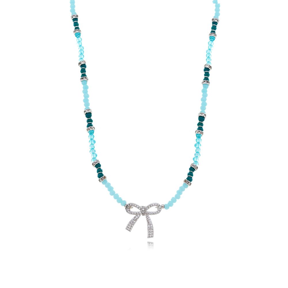Colar coleção aqua com pedrinhas de cristais e pingente de laço cravejado em zirconia, banhado á ródio