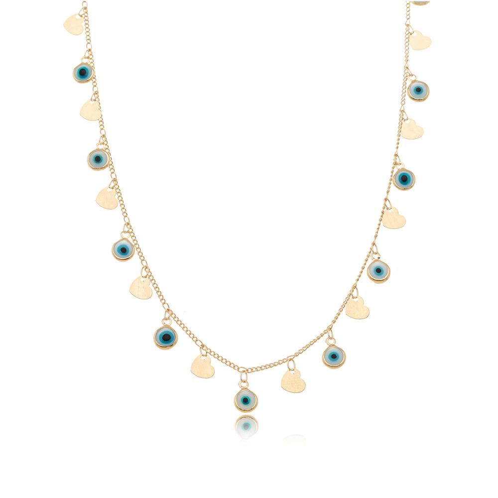 Colar Teen Choker Pingentes Corações Olhos Gregos Banho Ouro 18K Dourado U |