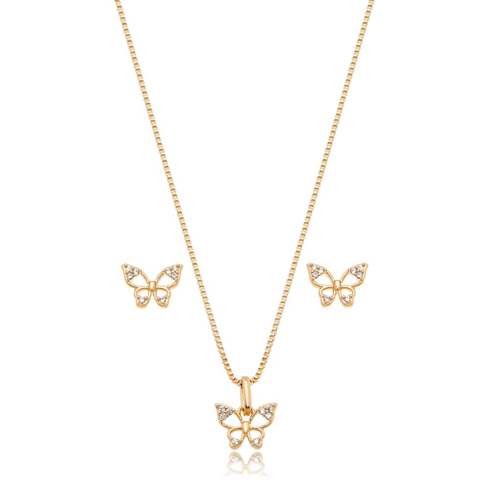 Conjunto Borboleta Vazado Detalhe Cravejado Banho Ouro 18K Zircônia Transparente U |