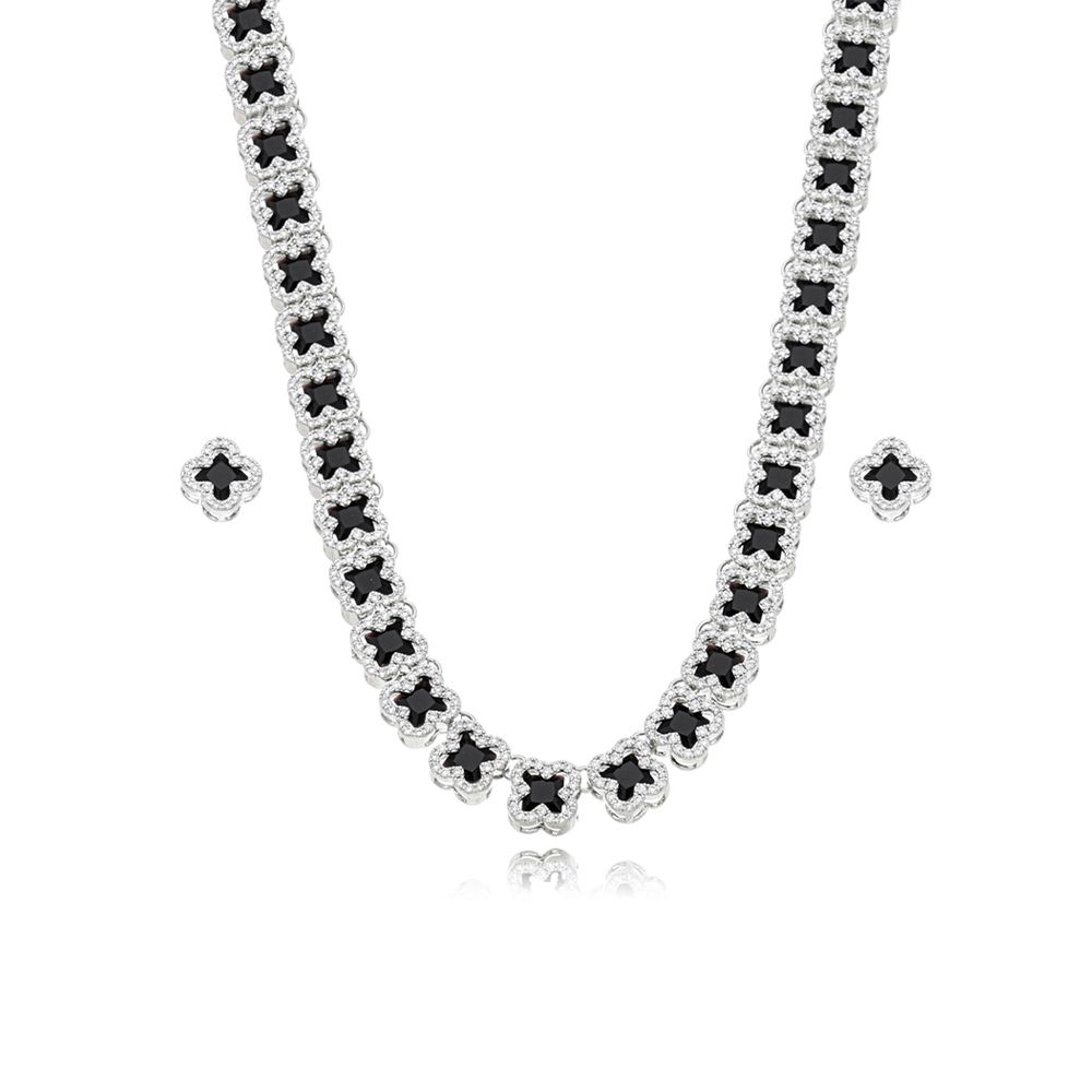 Conjunto Completo Trevos Cravejados Banho Prateado Zircônia Preto U |