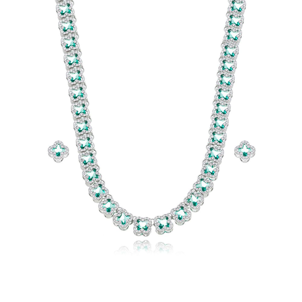 Conjunto Completo Trevos Cravejados Banho Prateado Zircônia Turmalina U |
