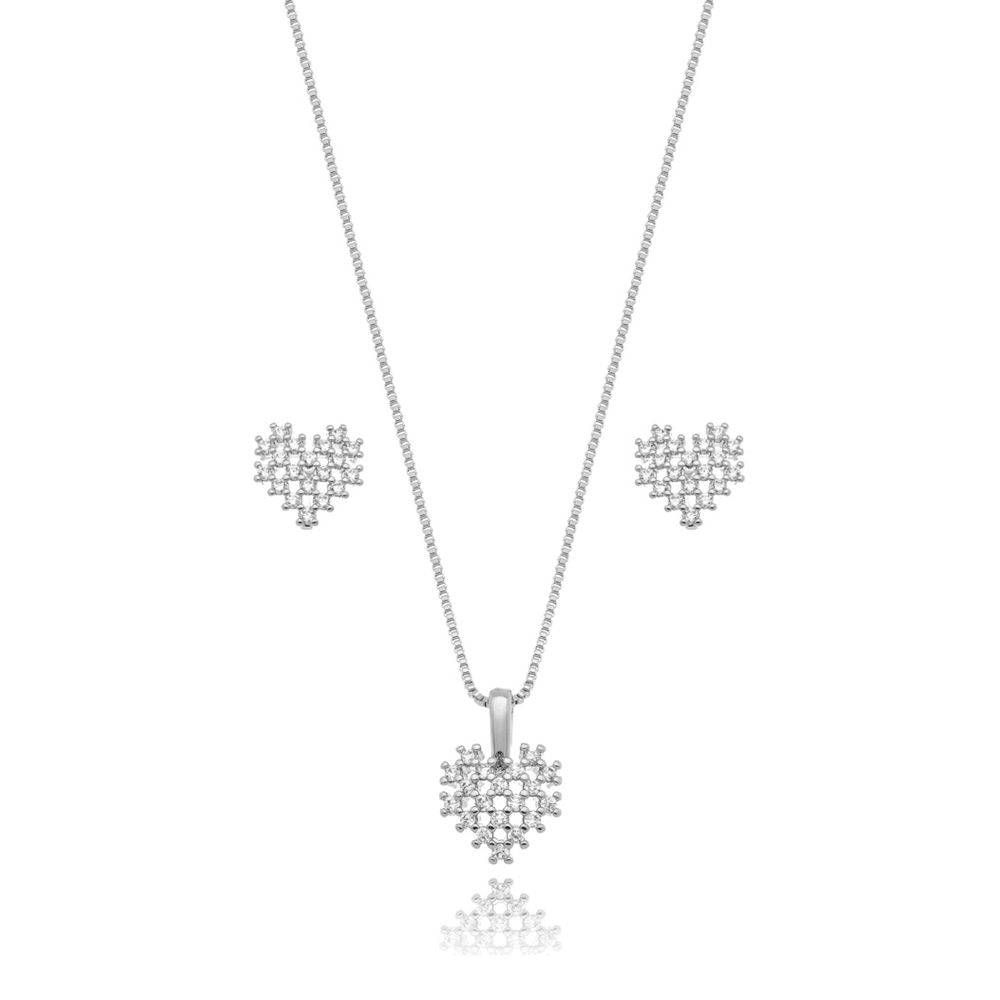 Conjunto Coração Vazado Cravejado Banho Ródio Zircônia Transparente U |