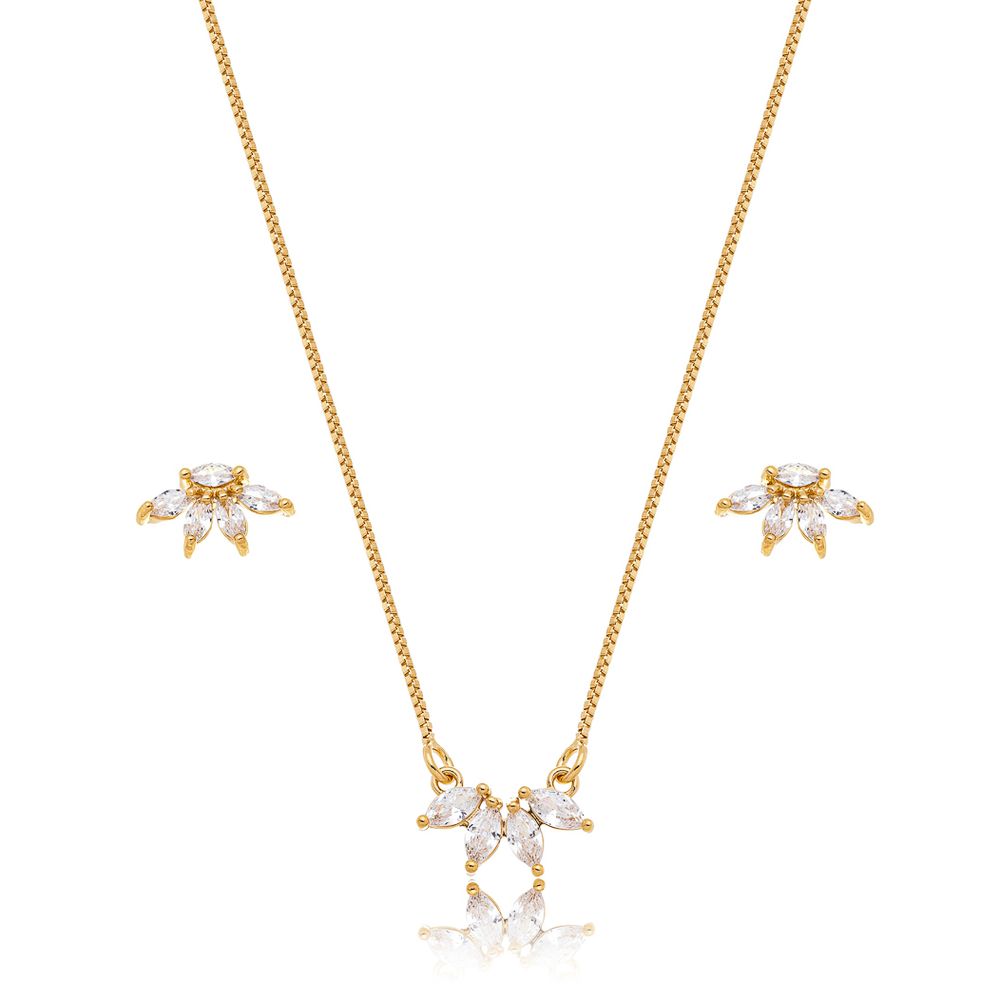 O Conjunto Coroa Navetes Banho Ouro 18k Cristal destaca cristais navete delicadamente posicionados, formando um desenho que lembra uma pequena coroa luminosa. Com banho ouro 18k, o conjunto une brilho sofisticado e estética contemporânea ¿ uma peça elegante para iluminar qualquer produção.