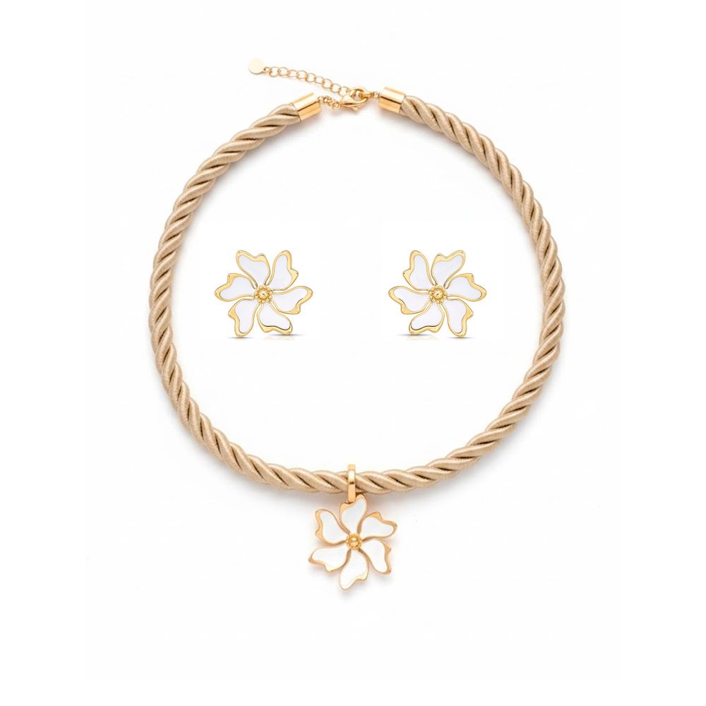 Conjunto Flor Esmaltada Banho Ouro 18K Branco U |