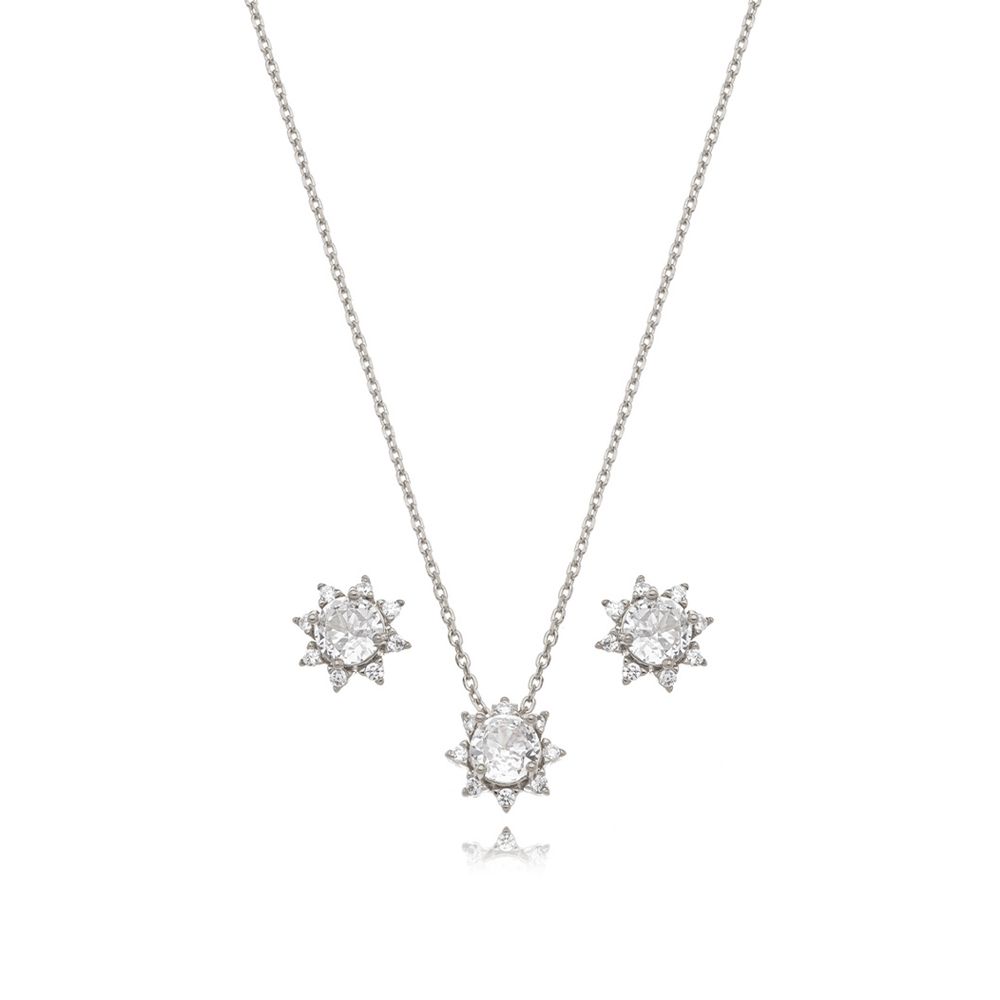 Conjunto Flor Ponto de Luz Banho Ródio Cristal Transparente U |