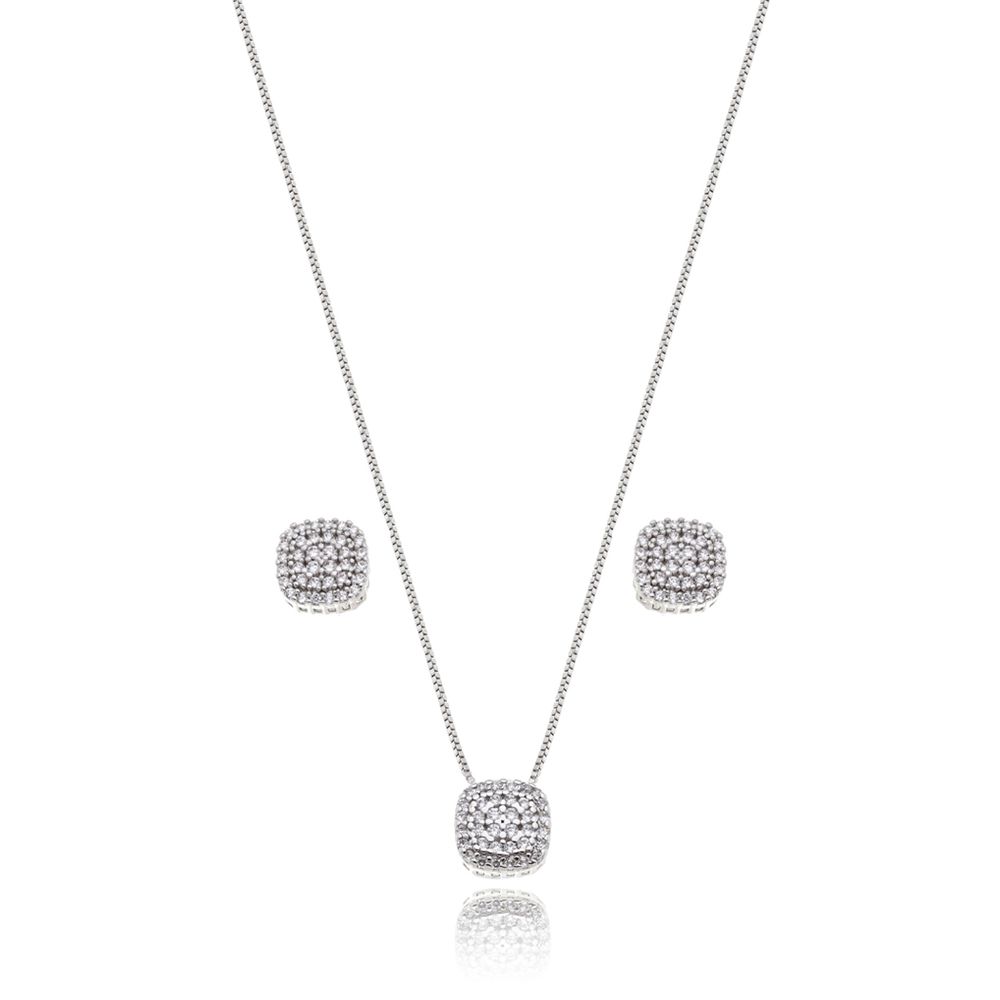 Conjunto com design geométrico cravejado em zircônias, que garantem brilho sofisticado e acabamento elegante. No banho Ródio, a peça ganha um visual moderno e atemporal, perfeito para iluminar produções com estilo e delicadeza.
