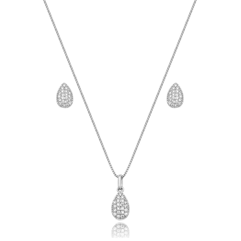 Conjunto Gota Cravejada Pavê Banho Ródio Zircônia Transparente U |