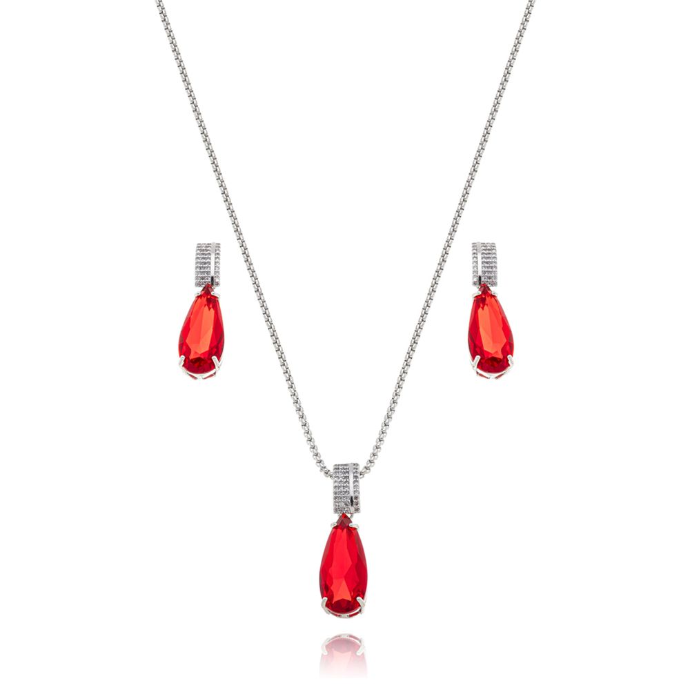 Conjunto em formato de gota com acabamento cravejado em cristais, proporcionando brilho elegante e sofisticado. Com banho prateado, é uma semijoia versátil e atemporal, perfeita para iluminar produções do dia a dia ou ocasiões especiais com delicadeza.