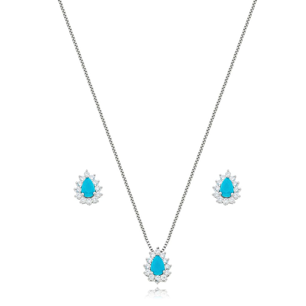Conjunto Gota Volta Cravejada Banho Ródio Zircônia Turquesa U |