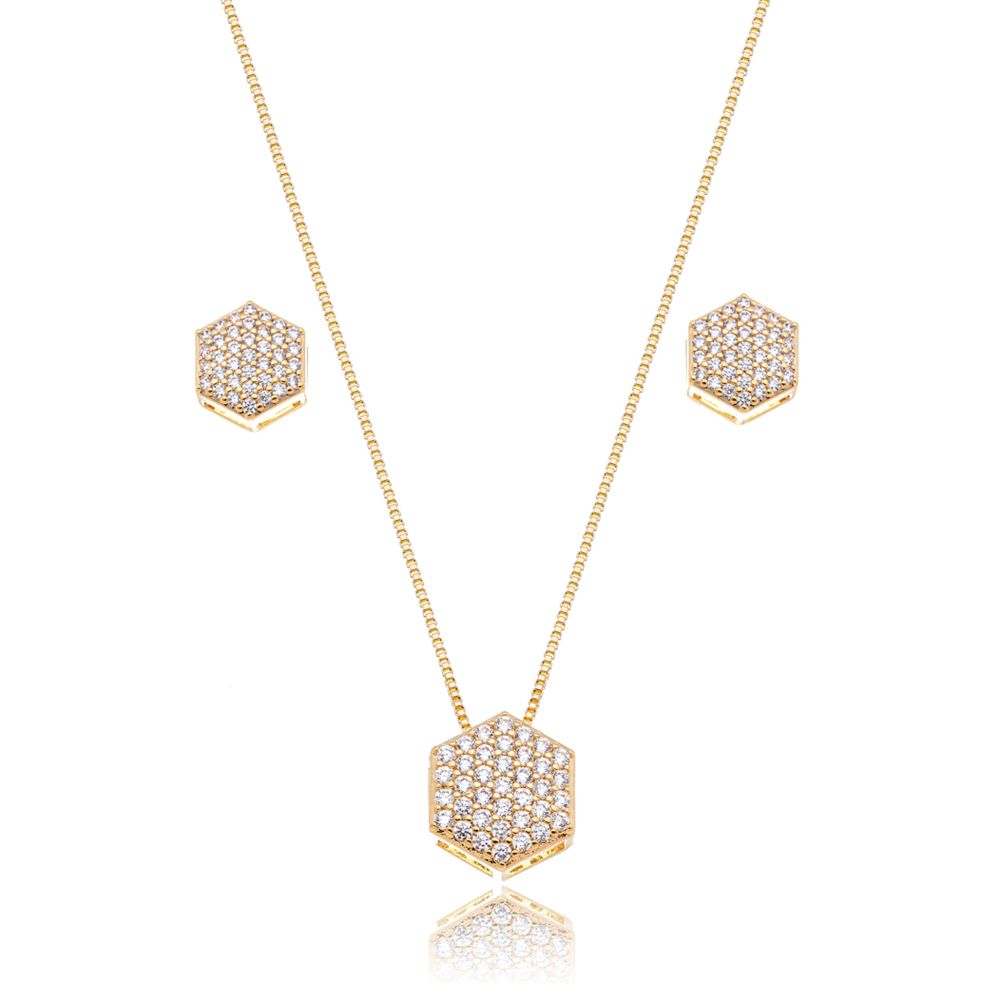 Conjunto Hexágono Cravejado Pavê Banho Ouro 18K Transparente U |