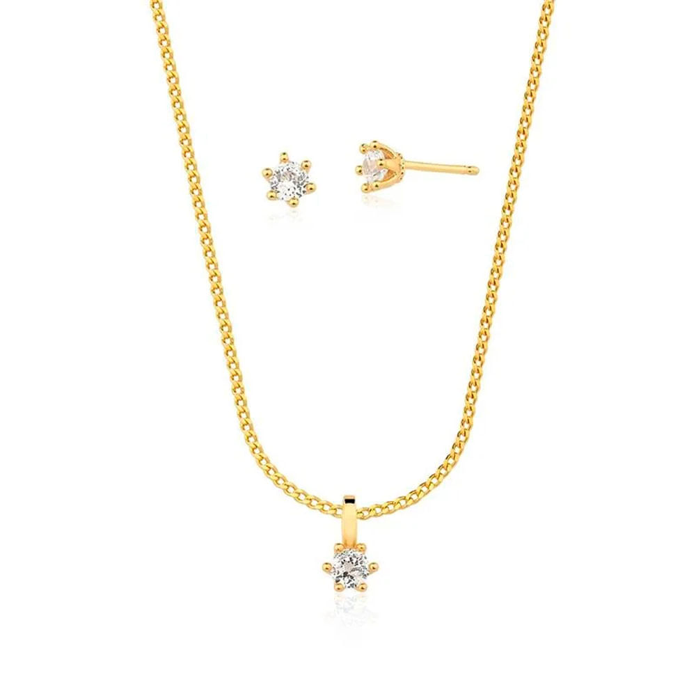 Um conjunto infantil com ponto de luz, incluindo brincos e colar, ambos com zircônia e banho de ouro 18K.