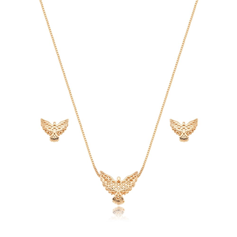 O banho em ouro 18K garante brilho nobre, acabamento refinado e excelente durabilidade, valorizando cada detalhe do conjunto. Versátil e cheio de simbolismo, é ideal para o uso diário ou para presentear, representando fé, proteção e elegância em uma única composição.