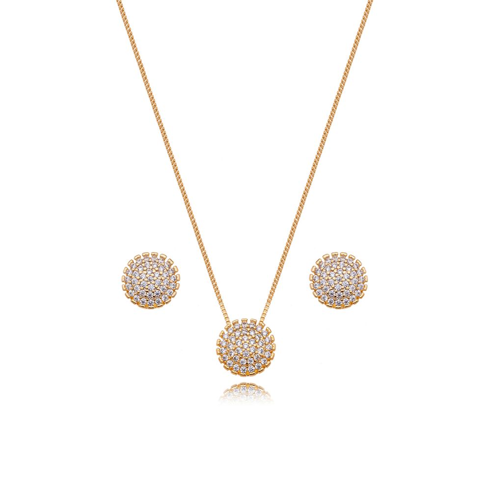 Conjunto Redondo Cravejado Banho Ouro 18K Zircônia Transparente U |