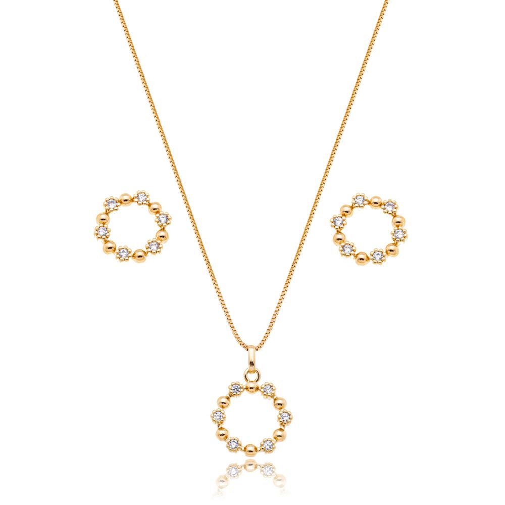 Conjunto Redondo Pontos de Luz Cravejado Banho Ouro 18K Transparente U |