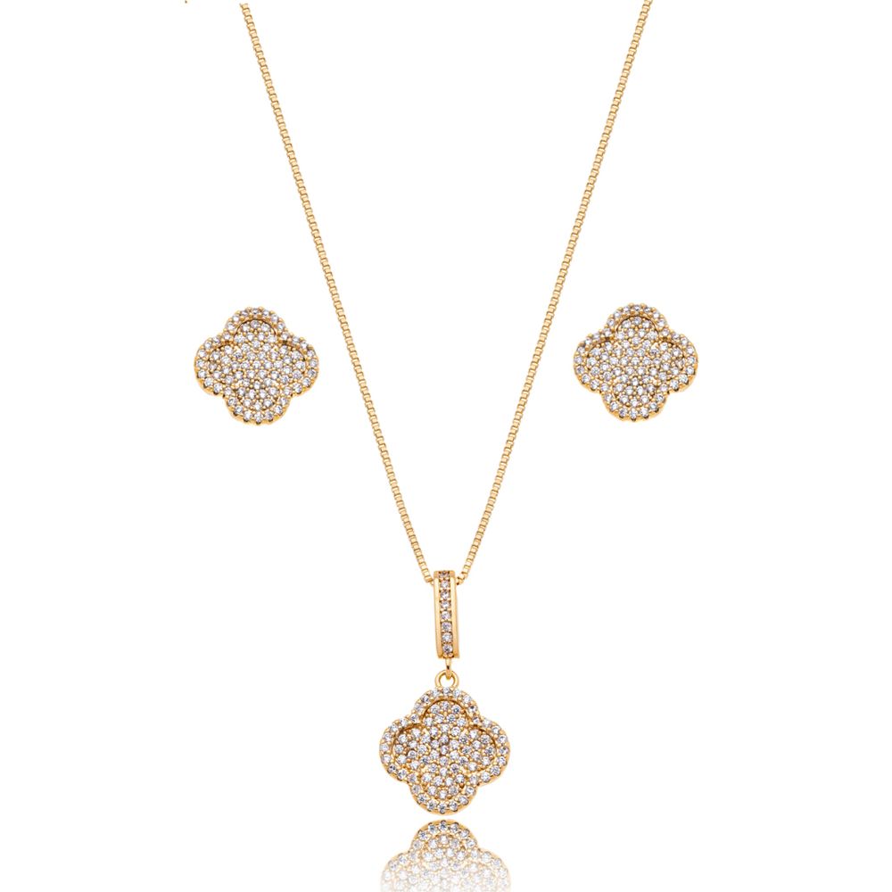 Conjunto Trevo Cravejado Banho Ouro 18K Zircônia Transparente U |