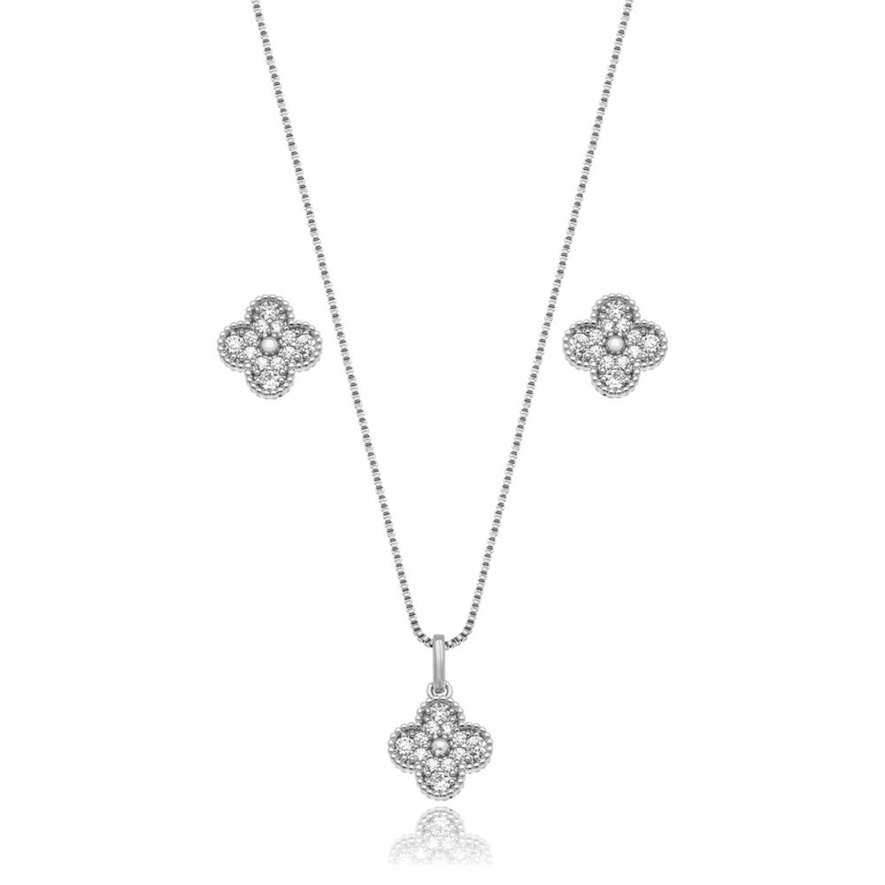 Conjunto Trevo Cravejado Banho Ródio Zircônia Transparente U |
