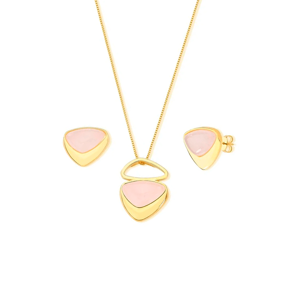 Conjunto Triangular Abaulado Pedra Central Banho Ouro 18k Quartzo Rosa U |