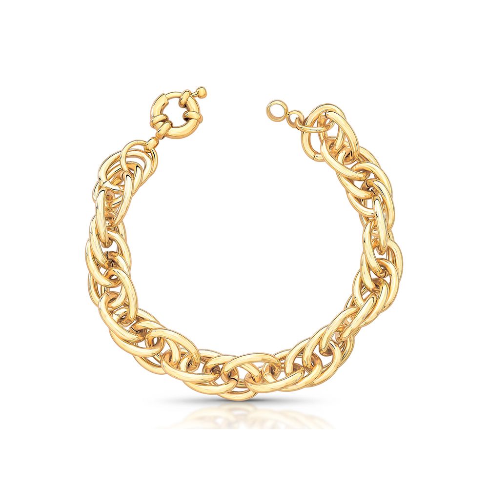 Pulseira composta por elos entrelaçados, criando um visual moderno, elegante e com acabamento impecável. Banhada a Ouro 18K, é uma peça versátil e sofisticada ¿ perfeita para complementar qualquer produção com brilho e estilo atemporal.