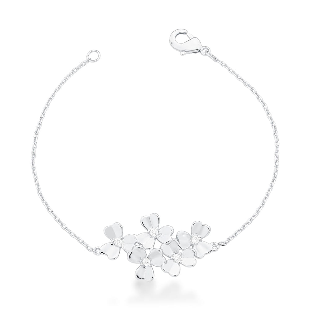 Pulseira banhada à ródio, com pingente de flores cravejadas no miolo em zircônias.
