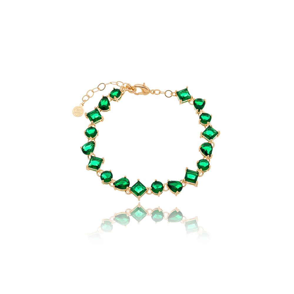 Pulseira com design de gota e formas geométricas, finalizada com cristal verde que adiciona um toque de cor elegante e sofisticado. Com banho dourado, é uma semijoia moderna e versátil, perfeita para iluminar o pulso com charme e estilo contemporâneo.