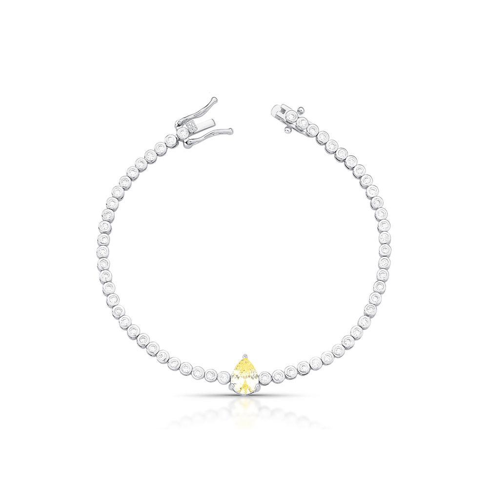 Pulseira estilo riviera com zircônias cravejadas e destaque central em gota de cristal amarelo, criando contraste elegante e brilho delicado. No banho Ródio, é uma semijoia refinada e versátil, perfeita para compor produções com luminosidade e estilo.